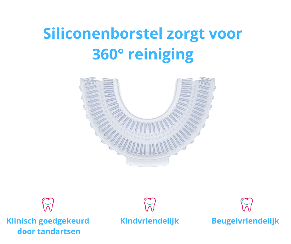 De zachte, U-vormige siliconenborstel poetst alle tandjes tegelijk - snel, veilig en zonder gedoe.